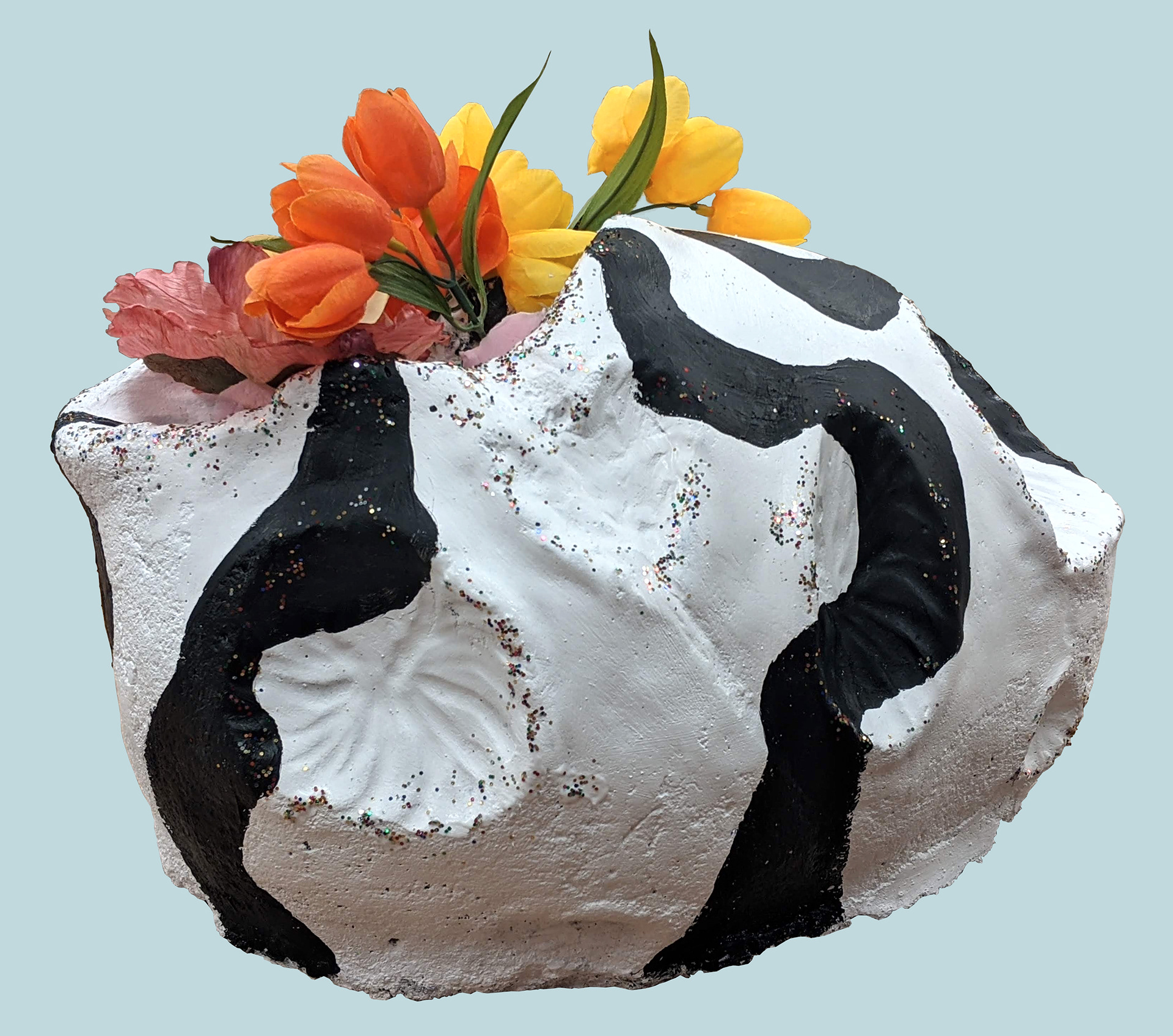 This piece was a collaboration with a classmate. We created an armature and sculpted the main form out of clay, then coated it in a plaster waste mold. We cleaned out the mold and poured in a concrete mixture. After the concrete solidified, we removed it from the mold and painted the serious form with high-contrast stripes. we added glitter around the holes to emphasize them, and added faux flowers to the largest of the holes.